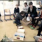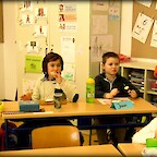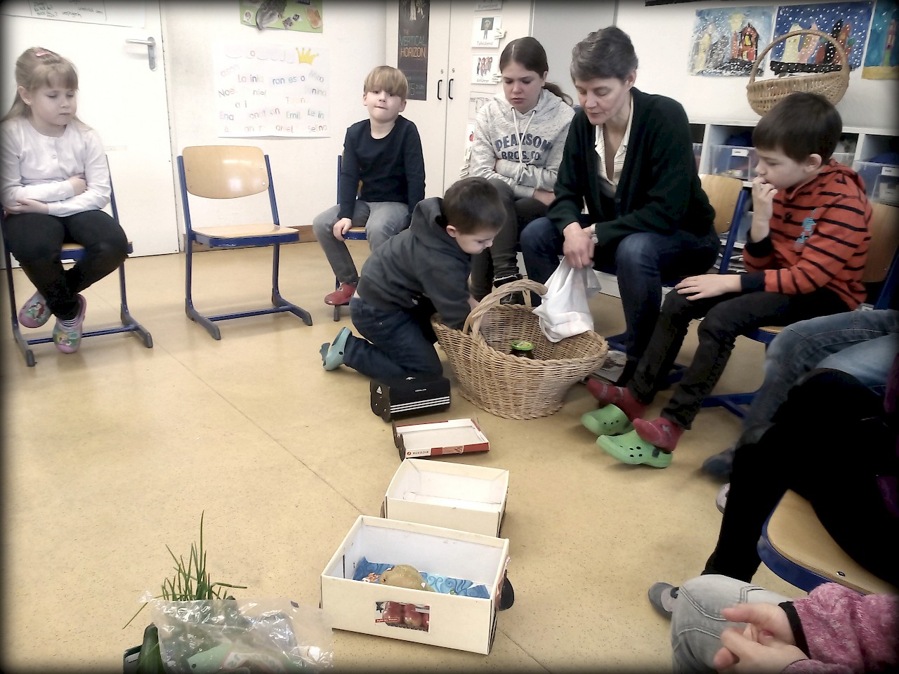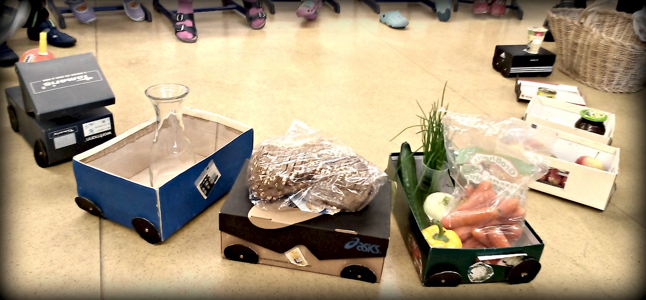 Anna Sutter erzählte unseren beiden ersten Klassen eine anschauliche Geschichte zum Thema Ernährung: Eine kleine Lok fährt mit ein paar Kindern in ein Ferienlager. Die Kinder haben an alles gedacht, außer an die Lebensmittel. Aber die kleine Lok weiß Rat: Sie weiß genau, welche Lebensmittel sie besorgen muss. So fährt sie zuerst zu einer Quelle, dann zu einer Mühle und schließlich auf den Markt. Mit vereinten Kräften füllen sie die Zugwaggons mit den mitgebrachten Lebensmitteln. Das Ferienlager ist gerettet!