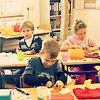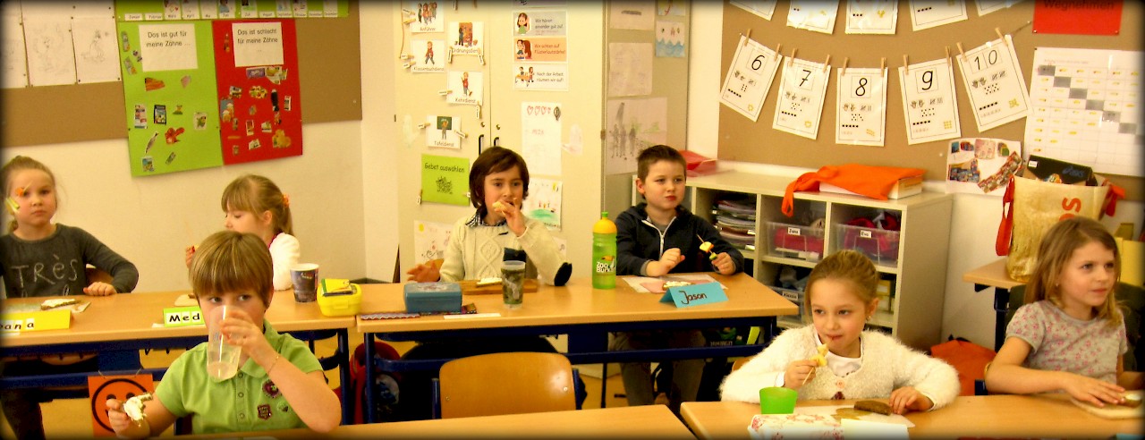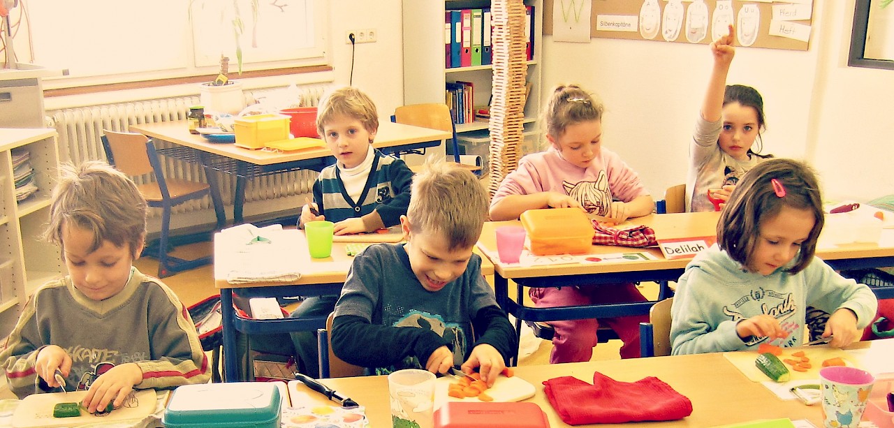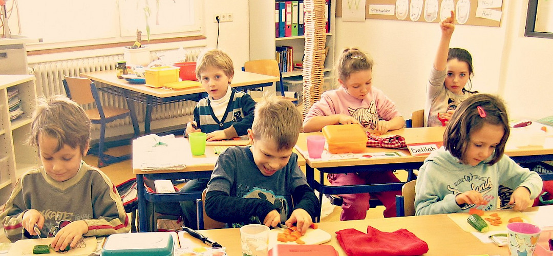 Anschließend bereiteten die Kinder gemeinsam ein gesundes Frühstück zu. Die Schülerinnen und Schüler schälten und schnippelten Gemüse, Obst und Schnittlauch. Nach getaner Arbeit erfrischten sich alle mit einem Becher kühlem Leitungswasser. Am Ende konnten die Obst-Gemüse-Spieße und der Schnittlauch-Dip mit Vollkornbrot genüsslich verzehrt werden!