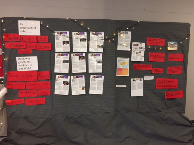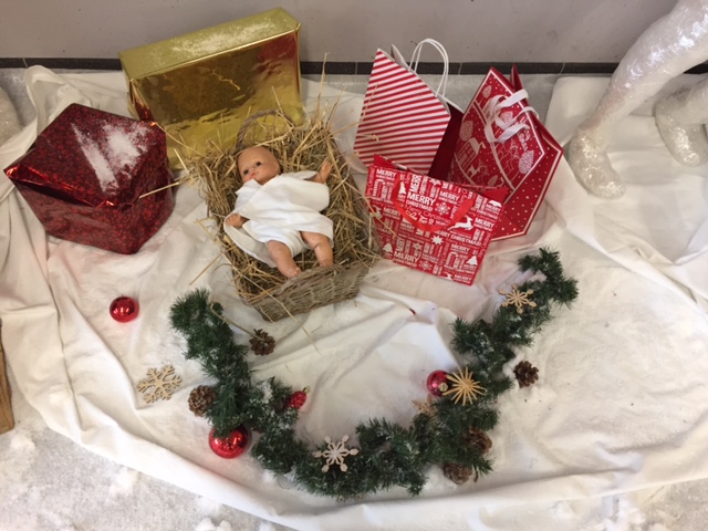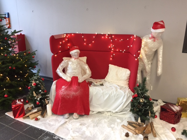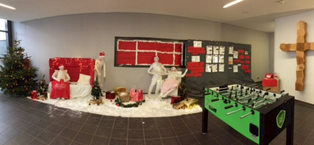 Im Foyer wurde eine Weihnachtsszene mit lebensgroßen, beinahe transparenten Figuren und einer kleinen Krippe in der Mitte aufgebaut. Die gesichtslosen Figuren entstanden im Kunstunterricht aus herkömmlichen Klebeband. Mark Jenkins, Street-Art-Künstler aus den USA stellt diese Art von Figuren seit 2003 in verschiedenen Städten im Freien auf. Seine Plastiken wirken nicht selten verstörend, weil sie einerseits lebensecht und doch seltsam fremd sind.