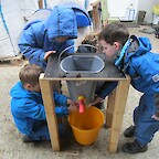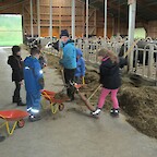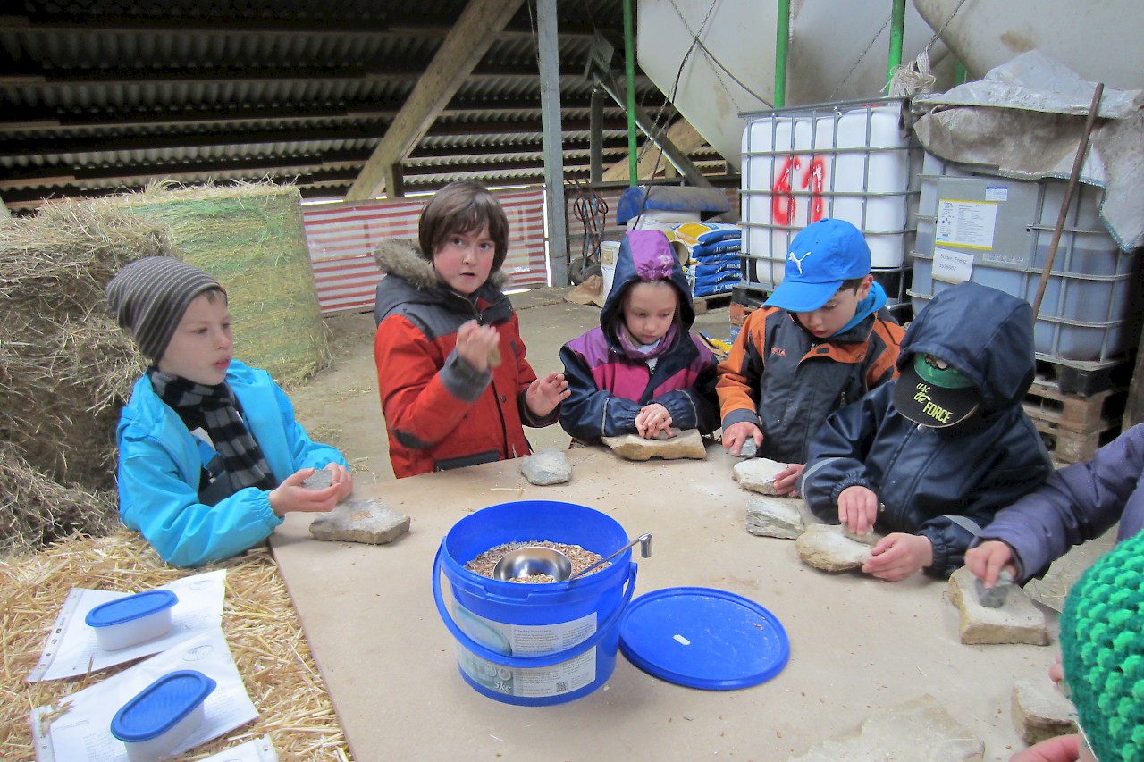 Jetzt durften die Schülerinnen und Schüler der beiden ersten Klassen den Gegenbesuch in Hohentengen-Lienheim antreten. Auf dem Hof von Anna und Franz Sutter gab es Vieles zu erleben: leckeren Punsch als Abhilfe gegen das eisige Wetter, Fühlkästen und einen neuen Milchviehstall mit Melkroboter. Die Schülerinnen und Schüler durften Kälber streicheln, Kühe füttern, Schubkarren fahren, Körner mahlen, Melkversuche am Modell durchführen, Müsli herstellen und dieses natürlich nach getaner Arbeit auch essen - lecker!