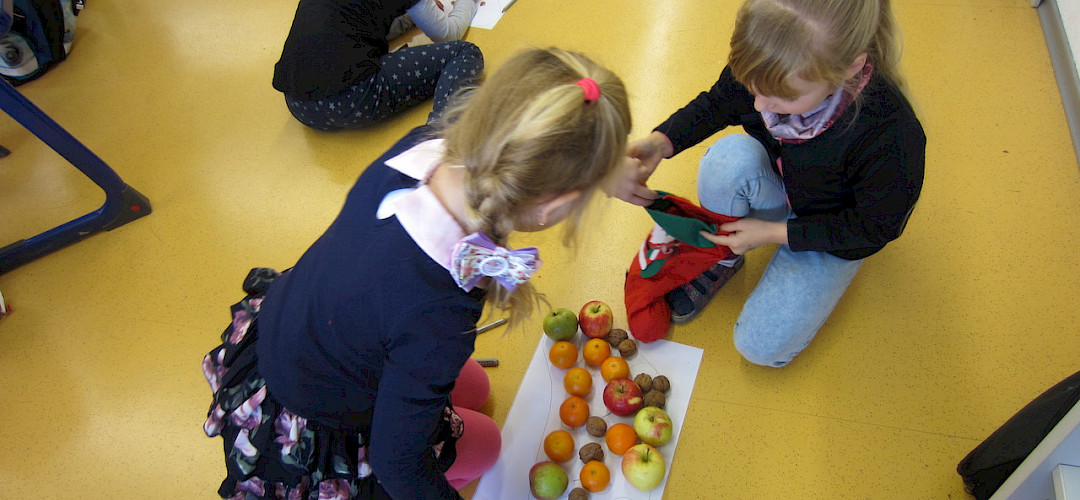 Er muss dringend Einkaufen gehen: Walnüsse, Mandarinen und Äpfel für die Nikolausstiefel will er besorgen. Aber welche Mengen braucht er? Wenn er für jedes Kind in der Klasse 2b und vielleicht sogar auch noch für die Parallelklasse einen Stiefel füllen will? Kannst du ihm helfen? Es wurden Stiefel gefüllt, gemalt, es wurde überlegt und schon über 100 gerechnet. Die Ergebnisse waren verblüffend und die Kinder staunten wie viel der Nikolaus einkaufen müsste: „165 Nüsse, nur für uns!“.