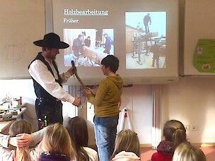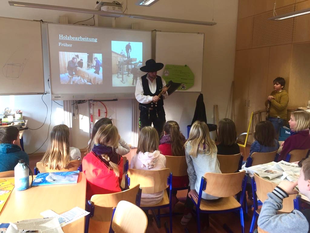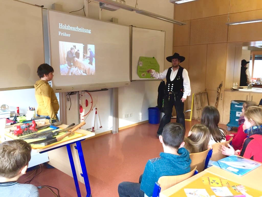 Der Vater eines Schülers der 4b stellte der Klasse seinen Beruf vor. Als Zimmerer erschien er standesgemäß in der traditionellen Zunftkleidung, der „Kluft“. Er erklärte seinen interessierten Zuhörern wie man früher Holz bearbeitete. Besonders beeindruckt waren die Viertklässler von den Werkzeugen aus alten Zeiten, die Herr Lasch zur Veranschaulichung mitgebracht hatte.