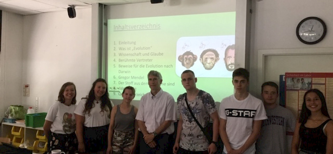 Weiterhin nahm sich Burgess Zeit, um mit Schülerinnen und Schülern der Klassenstufe 9 über das Thema Evolution zu diskutieren. Dabei wurde deutlich, dass der Mensch nicht geschaffen wurde, um lediglich überleben zu können. Es muss einen Schöpfer, einen „Designer“ des Lebens geben. Allein die menschliche Hand kann so viel mehr als nur Früchte sammeln und sich im Kampf verteidigen. Abgerundet wurde die Diskussion mit einem Vortrag (GFS) von Tobias Bartsch über Charles Darwin.