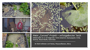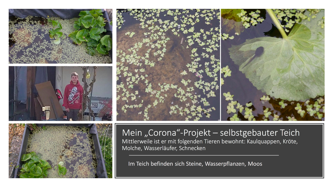 Marius hat im Mai zu Hause einen schönen Teich angelegt, Michael hat eine alte Nähmaschine wieder in Gang gesetzt und damit Stoffmasken genäht. Jonathan hat in einem Video dokumentiert, wie wunderbar leicht das Lernen zu Hause von der Hand ging.