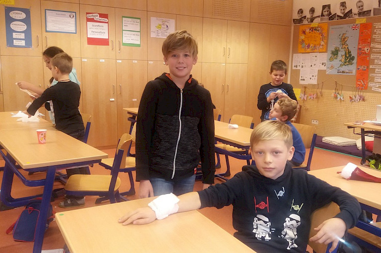 CSH-Schülerinnen und Schüler der Jahrgangsstufe 3 und 4 lernen im Atelierunterricht, Erste Hilfe zu leisten.